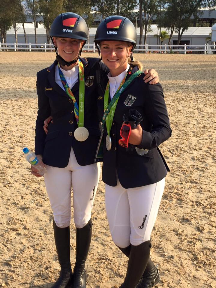 Mein Springtrainer Marcus Döring ist extra nach Rio gekommen, um uns zu unterstützen. Wir haben gemeinsam den technisch anspruchsvollen Pacours angeschaut und Marcus hat mir noch einige hilfreiche Tipps mit auf den Weg gegeben. Wolle ging eine tolle erste Runde und nach Ingrid's Ritt wusste ich, dass eine Medaille noch möglich sein könnte. Durch die Fehler der anderen Nationen kamen wir einer Medaille immer näher und dann sagte Marvik zu mir: "Ihr habt Bronze sicher". :-) Nach dem nächsten Reiter wurde dann aus Bronze sogar noch Silber - echt unglaublich!!! :-) In Bergedorf will man für mich Samba tanzen, wenn ich mit einer Medaille nach Hause komme. Hier ist sie nun - fangt besser schon mal an zu üben! ;-)