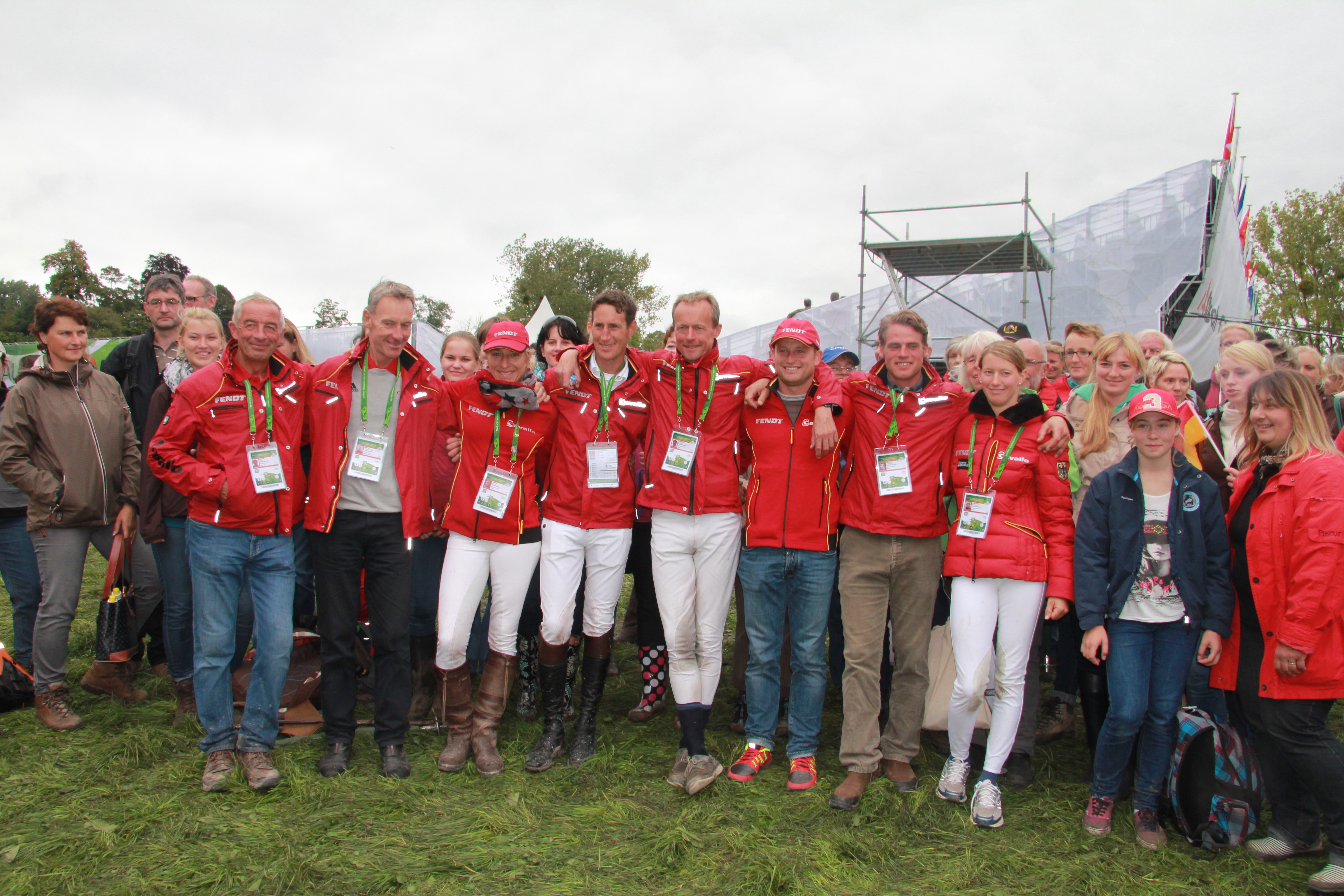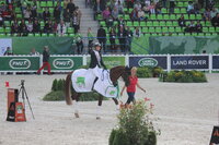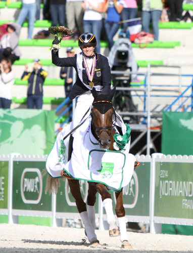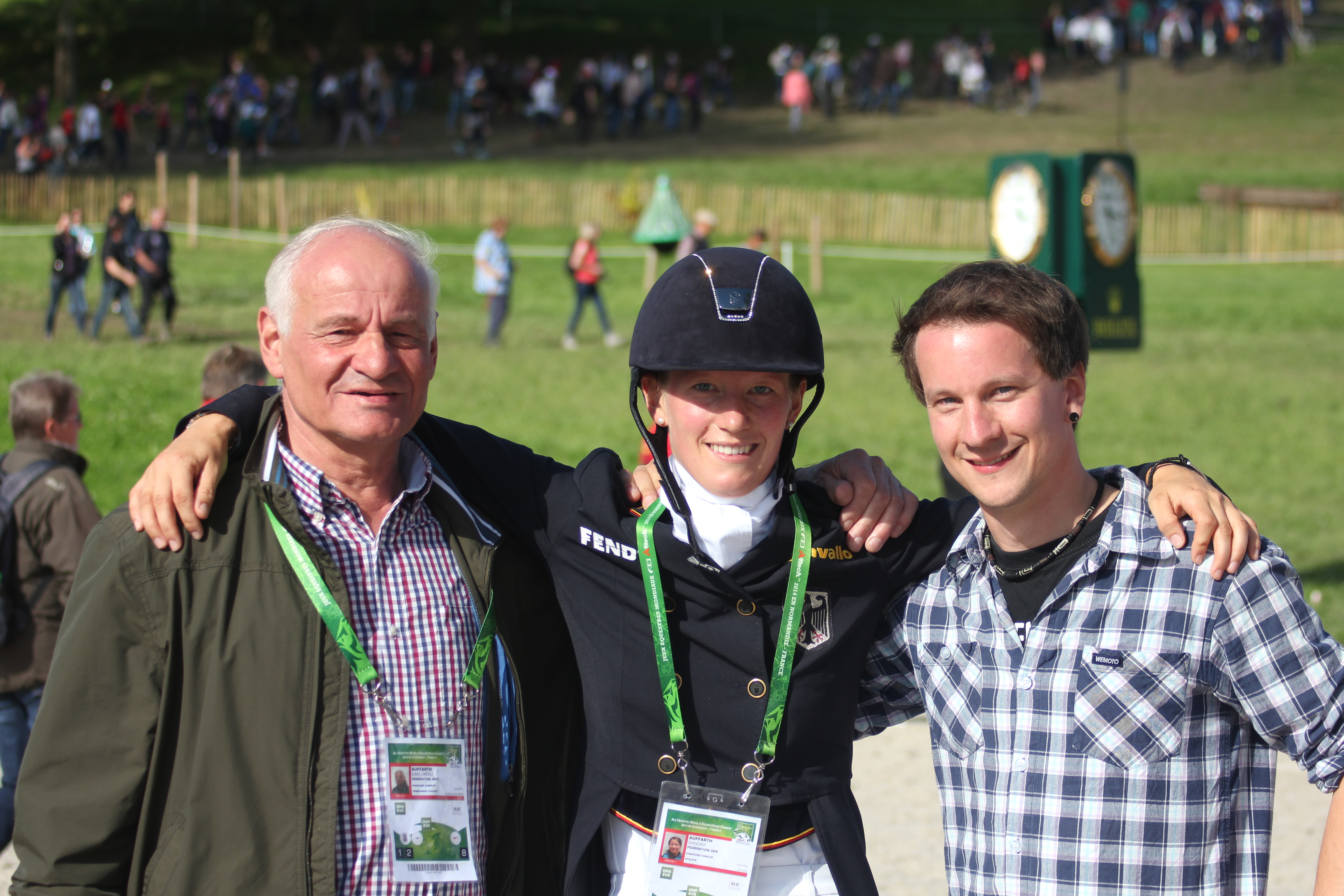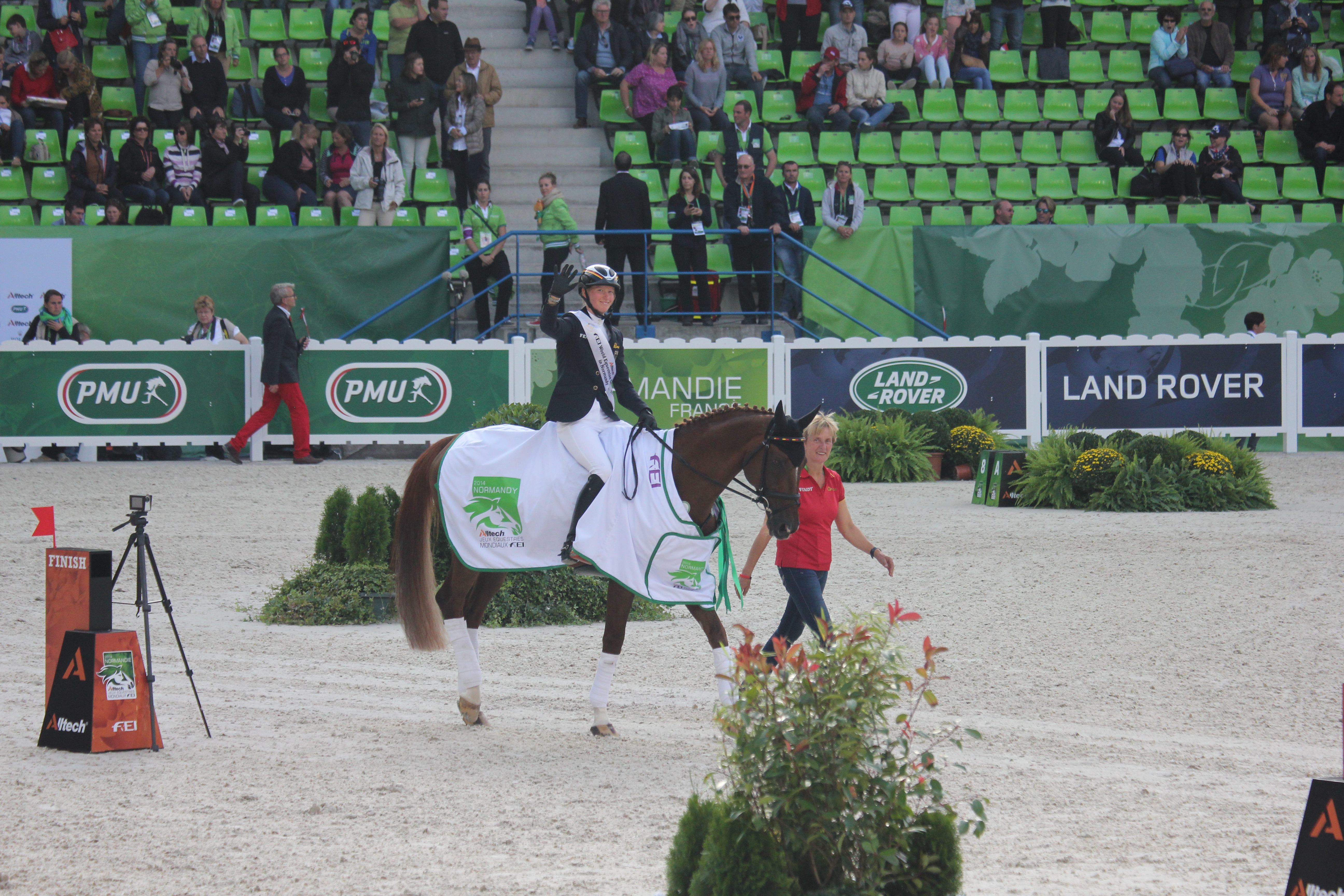 Wolle und ich sind über die Jahre ein so starkes Team geworden, welches sich in allen Disziplinen wiedergespiegelt hat. In der Dressur war er zunächst etwas nervös und ich wartete ein paar Minuten, um ihm Zeit zu geben. Sobald er schnaubte, sich die Anspannung löste, fing ich an seine Stärken raus zu reiten, sodass wir in der Galopptour wirklich punkten und uns an die Spitze setzten konnten. Vor meinen Geländeritt war ich etwas nervös. Nicht, weil ich der Meinung war wir können das nicht, sondern das richtige Gefühl zu finden, mein einzigartiges Pferd gesund und fit durch das Gelände zu reiten, alles zu geben, um nicht zu weit nach hinten zu rutschen, aber auf keinen Fall etwas zu riskieren. Wolle machte einen super guten Job. Ich war so froh als ich auf der Zielgeraden merkte, er hat noch Kraft und kämpft weiter. Für mich persönlich war dieses Gefühl wichtiger als jede Medaille. Er hat sich schnell von dem anstrengenden Geländeritt erholt und trabte am Abend sehr, sehr gut!! Auch die Verfassung am nächsten Morgen passierte er ohne Probleme. Nun mussten wir mit allen Pferden und LKWs nach Caen umziehen, um dort im großen Stadion das abschließende Springen zu reiten. Für die Pferde war das ein sehr anstrengendes Wochenende. Die Stimmung im großen Stadion war dafür super gut. Mit Wolle habe ich es wirklich nicht schwer die Nerven im abschließenden Springen zu behalten. Es macht einfach nur Spaß und die Freude war bei allen riesig. Als ich dann gesagt bekam, dass William einen Fehler machte, konnte ich es kaum glauben!! Wolle und ich-Doppelweltmeister!!! Wow! Die Siegerehrung war einfach toll. Die deutsche Fankurve tobte und man kann einfach nicht fassen, dass man zweimal auf die Goldene Mitte des Podests hüpfen darf!!